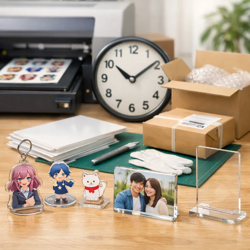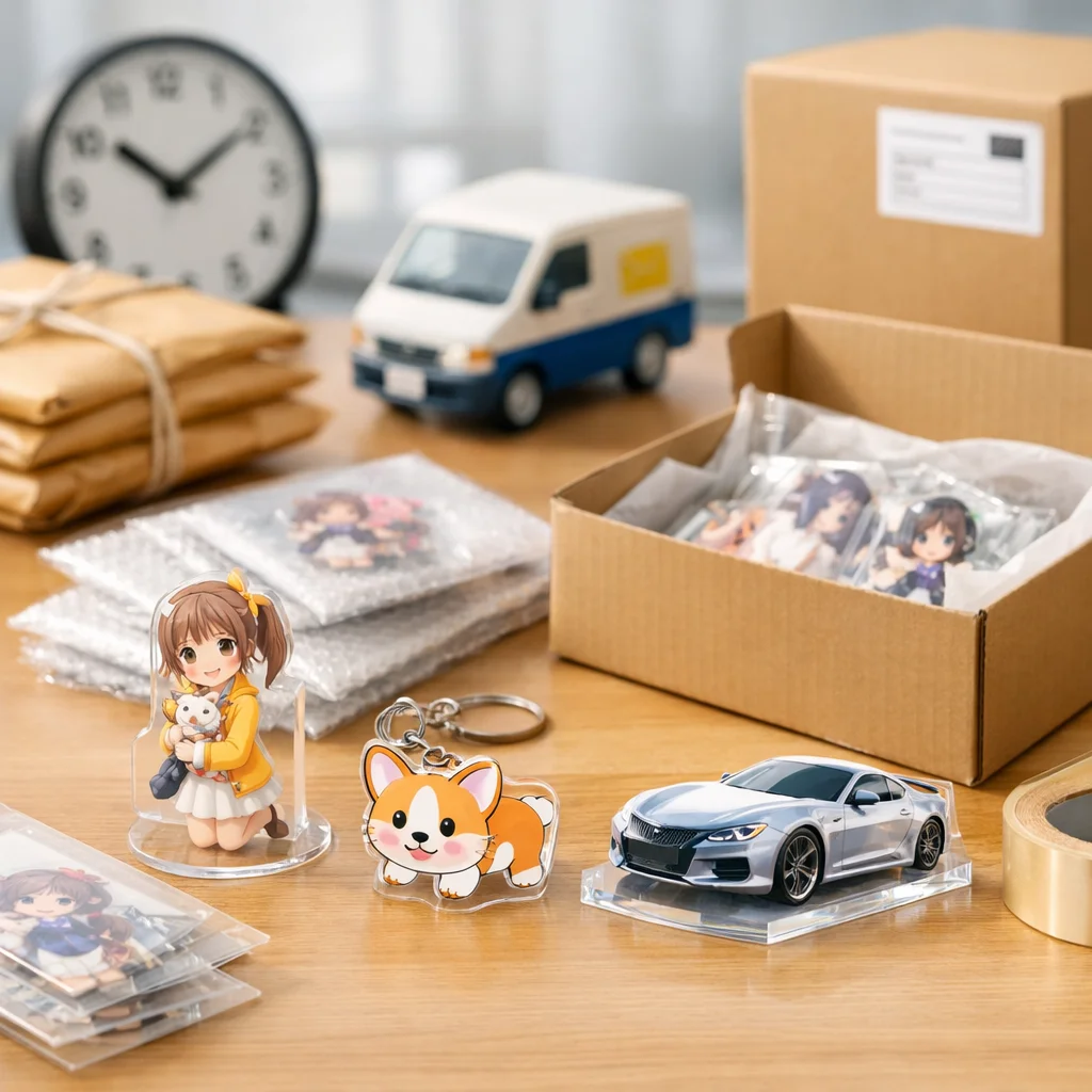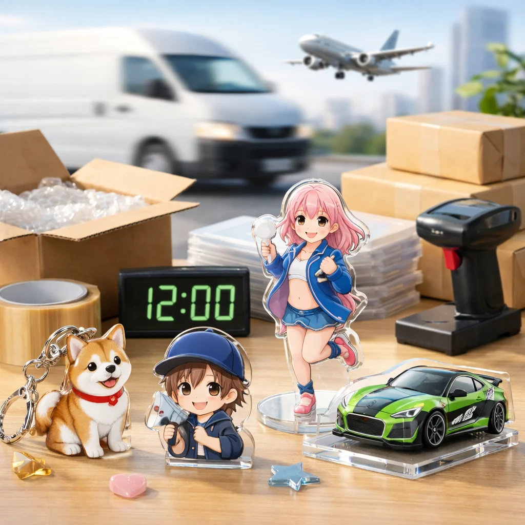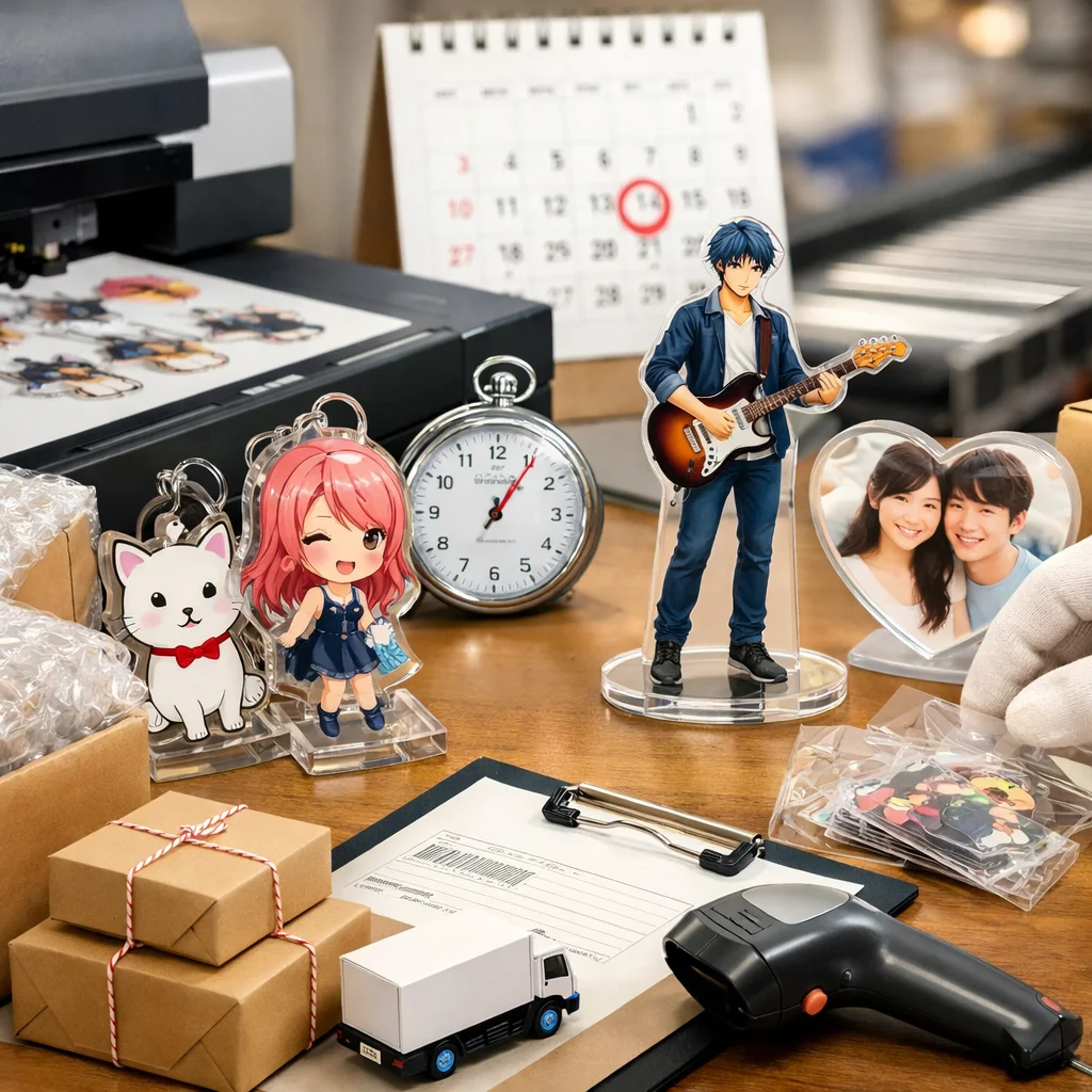 在庫/生産:在庫があるアクリルグッズは、即日発送が可能です。ただし、受注生産や在庫切れの場合、通常納期が適用されます。 (参考: akt-japan.com)