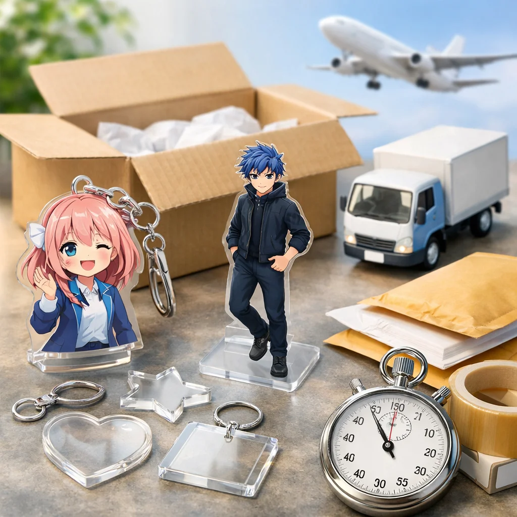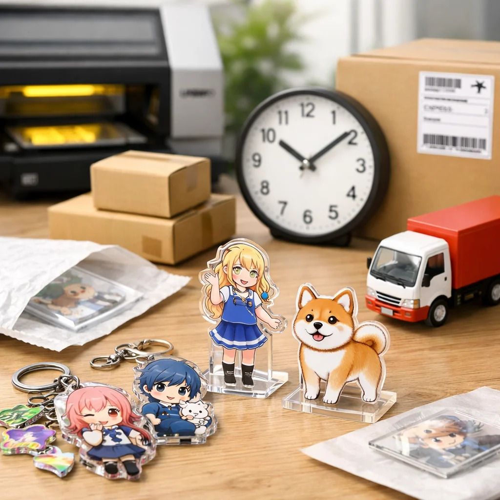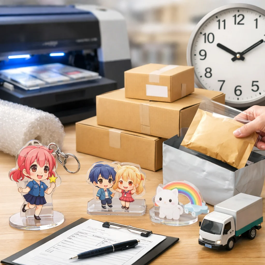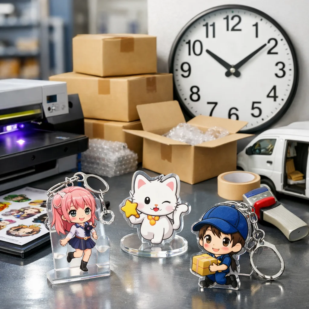 在庫/生産:在庫があるアクリルグッズは、即日発送が可能です。ただし、受注生産や在庫切れの場合、通常納期が適用されます。 (参考: akt-japan.com)