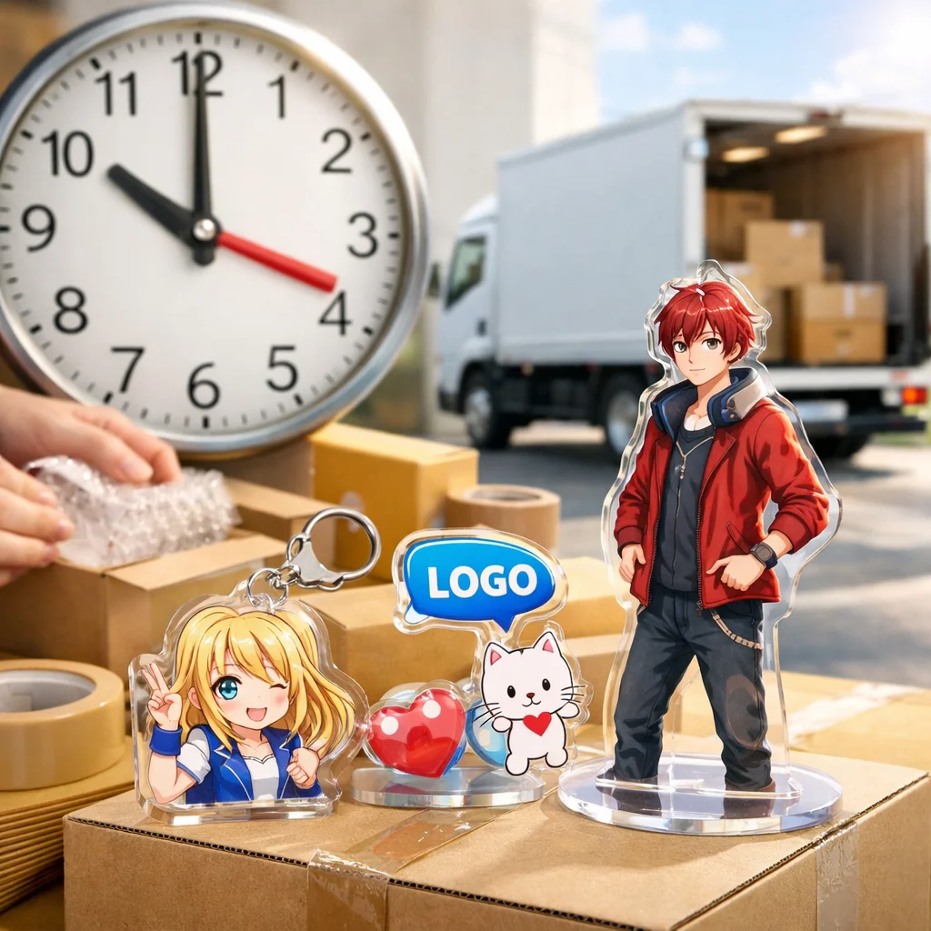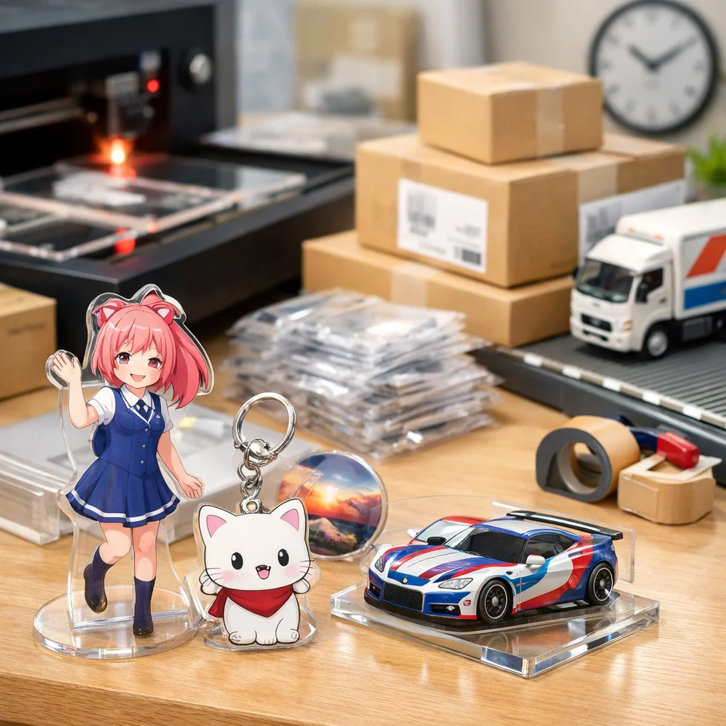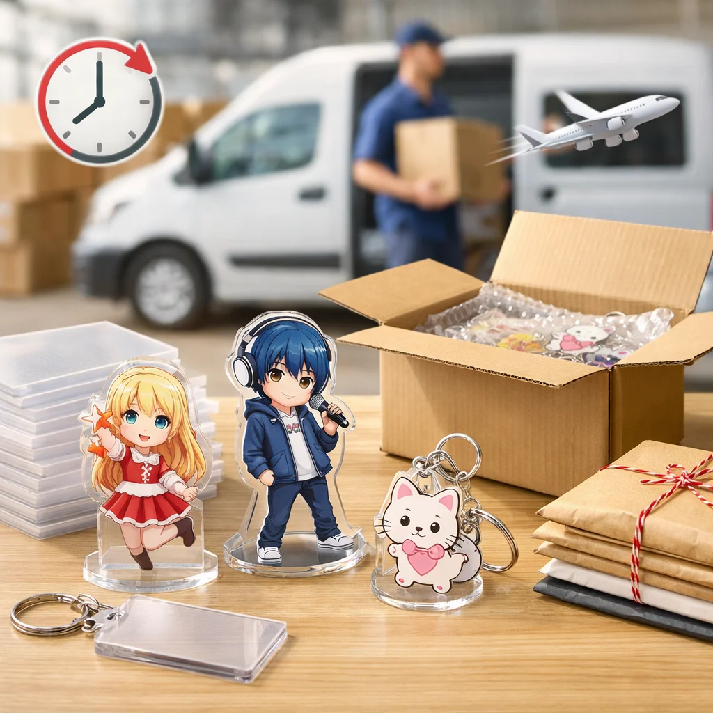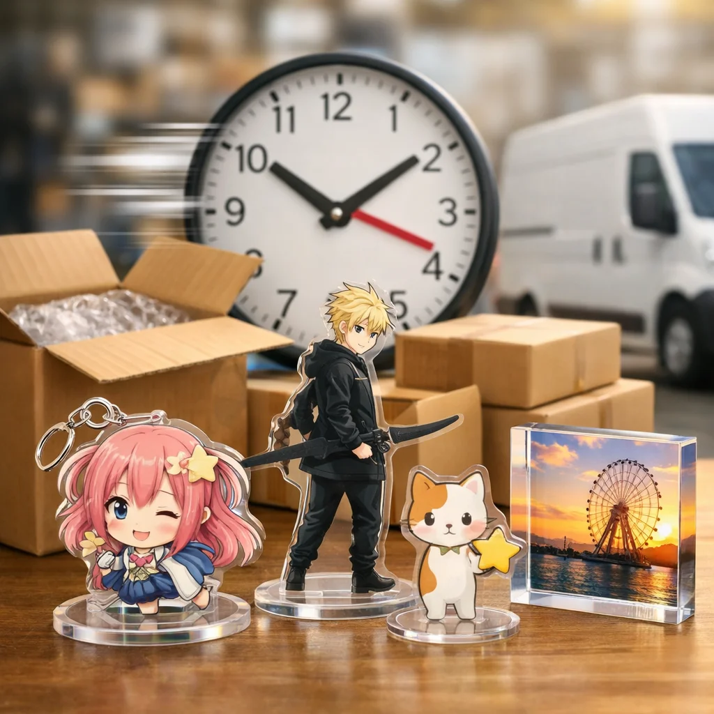 在庫/生産:在庫があるアクリルグッズは、即日発送が可能です。ただし、受注生産や在庫切れの場合、通常納期が適用されます。 (参考: akt-japan.com)