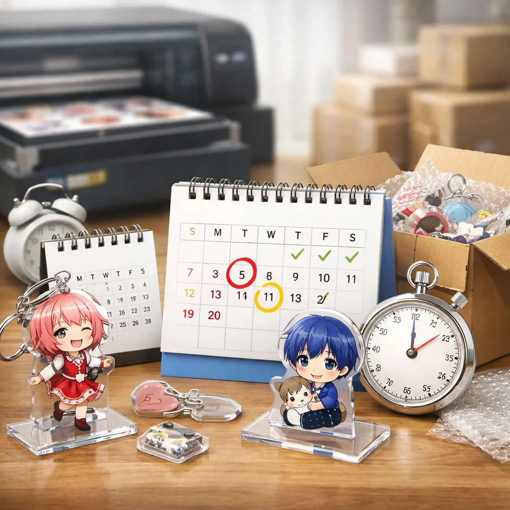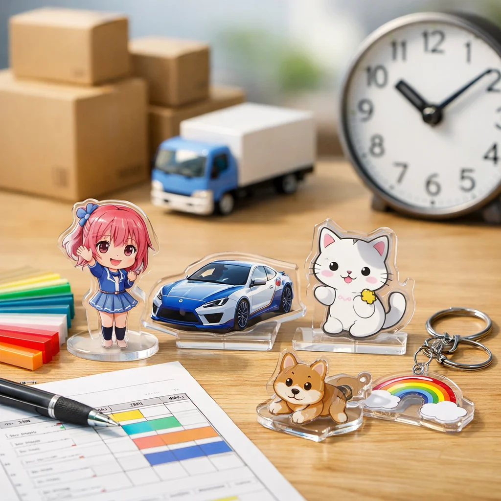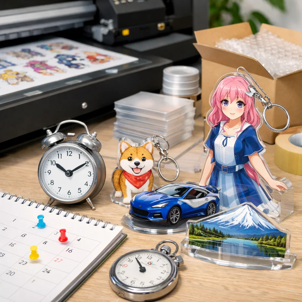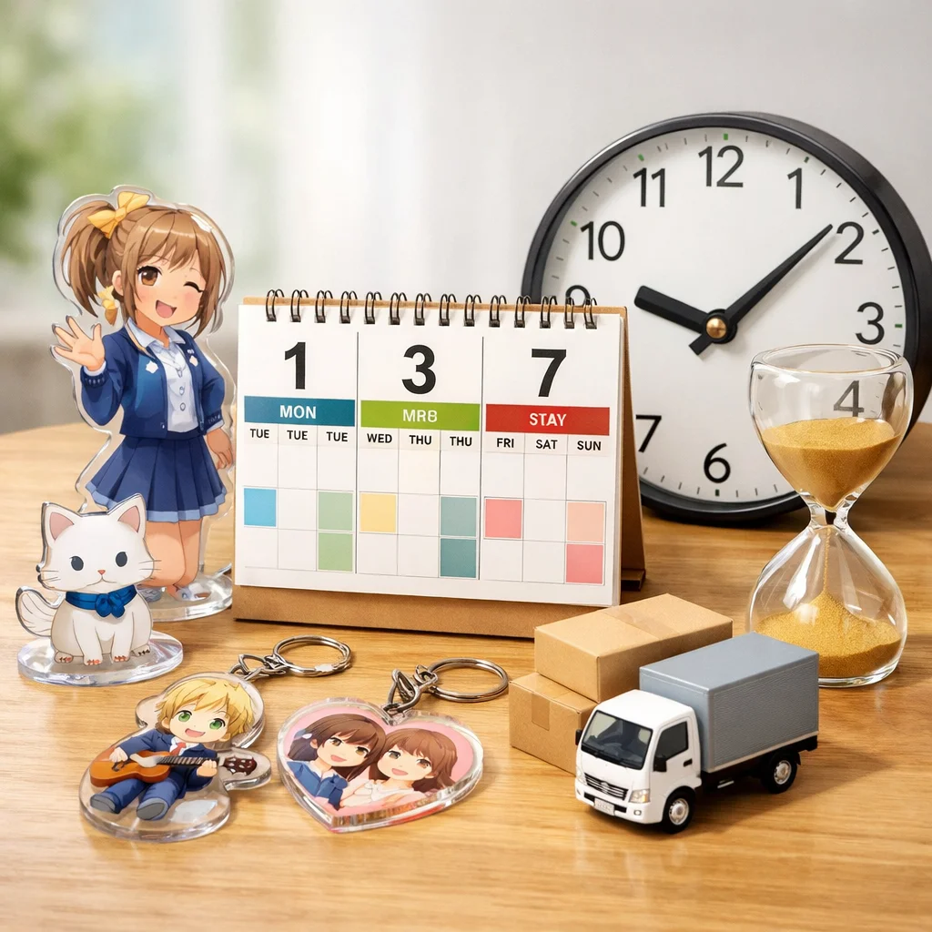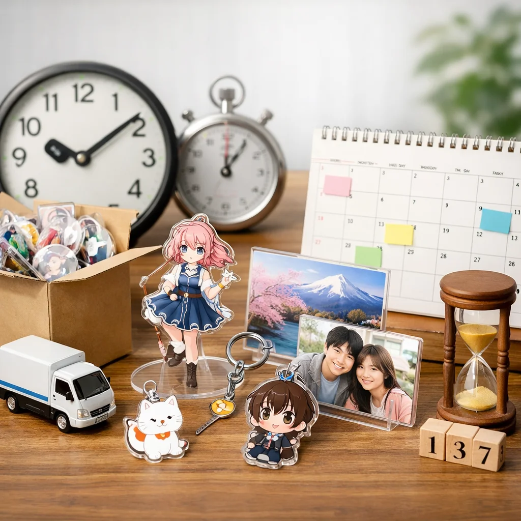 アクリルグッズの納期の長さや短さは、ビジネスにさまざまな影響を与えます。機会損失や品質リスクを減らすために、逆算やバッファ設定などの対策が重要です。
