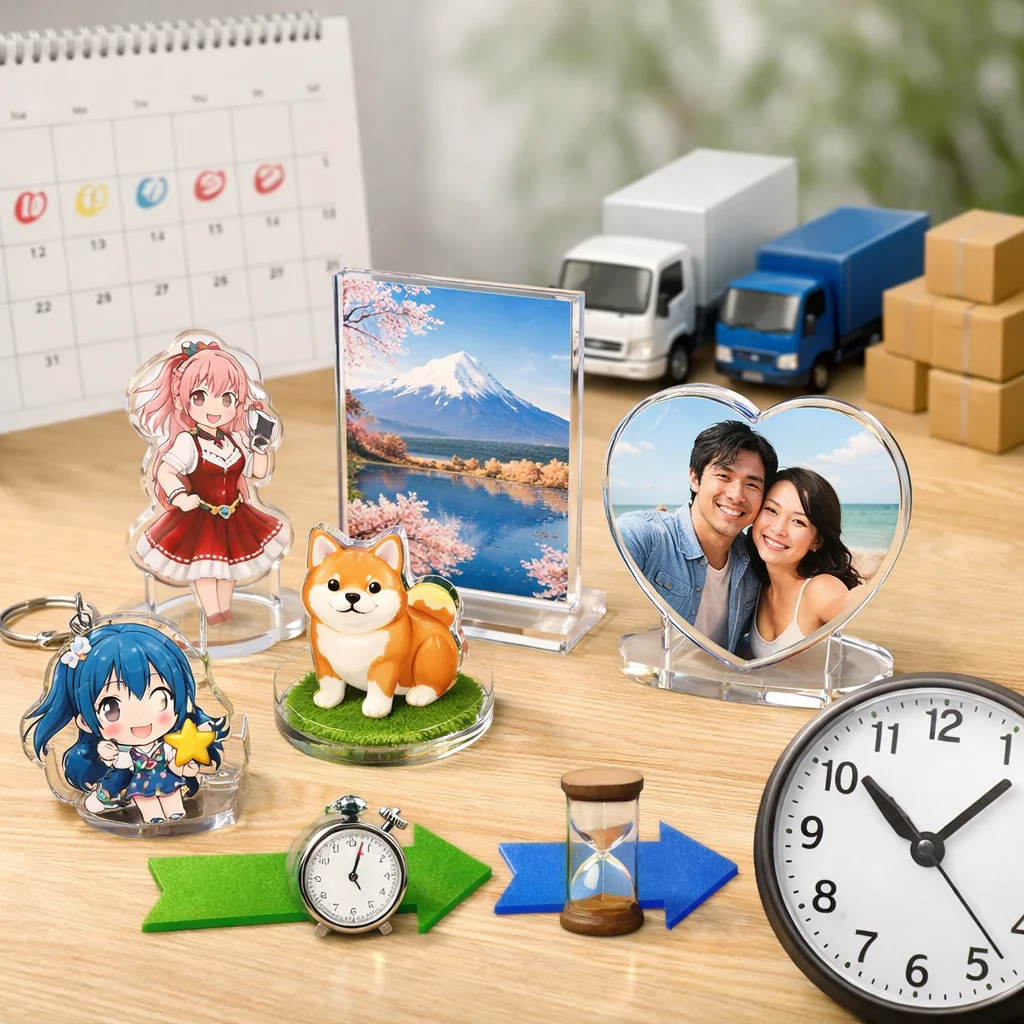 アクリルグッズの納期は、製造工程や業者、繁忙期によって大きく異なります。比較する際は、複数の業者を検討することが重要です。