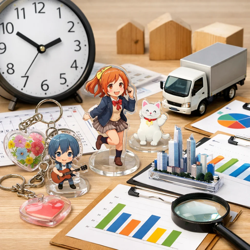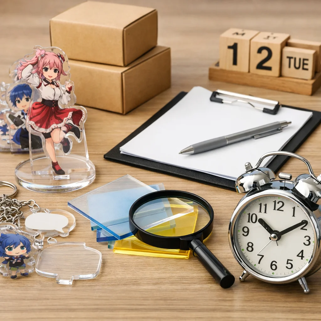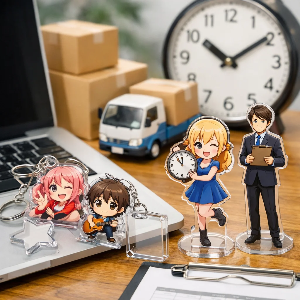 これらの事例から、アクリルグッズの納期は依頼内容や数量、仕様によって大きく変動することがわかります。遅延を防ぐためには、事前の計画と業者選びが重要です。信頼できる業者を選び、余裕を持ったスケジュールで発注することが、スムーズな制作と納品につながります。