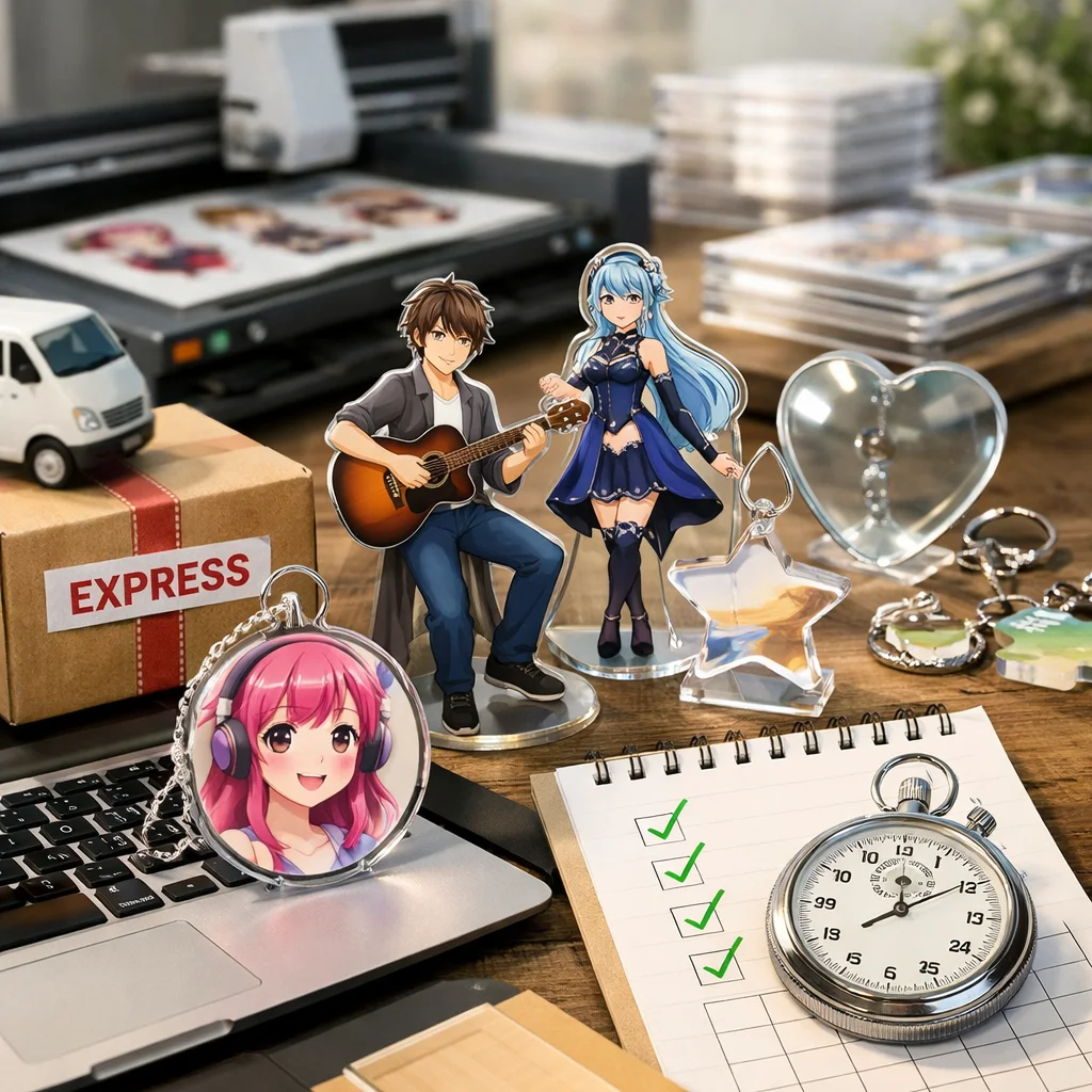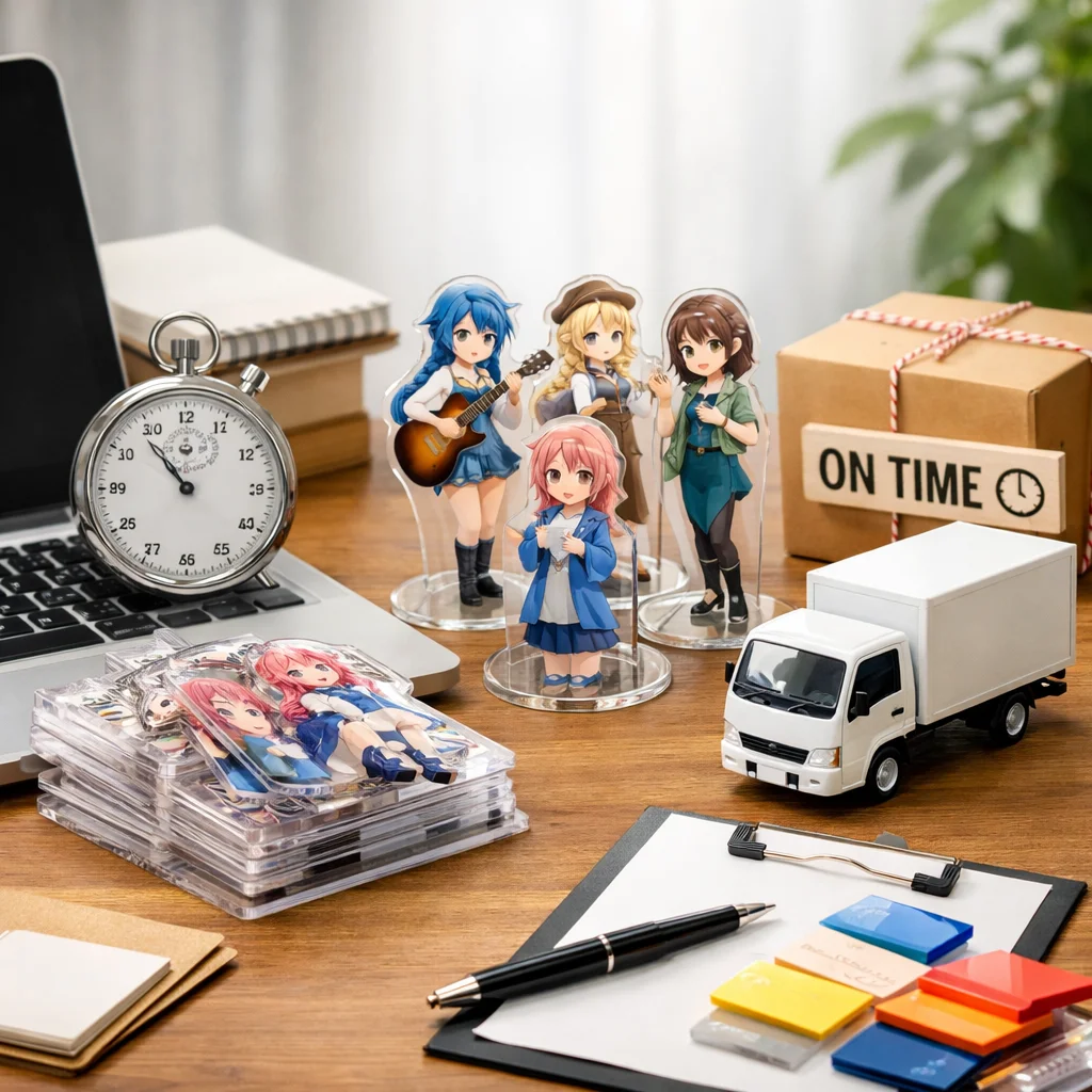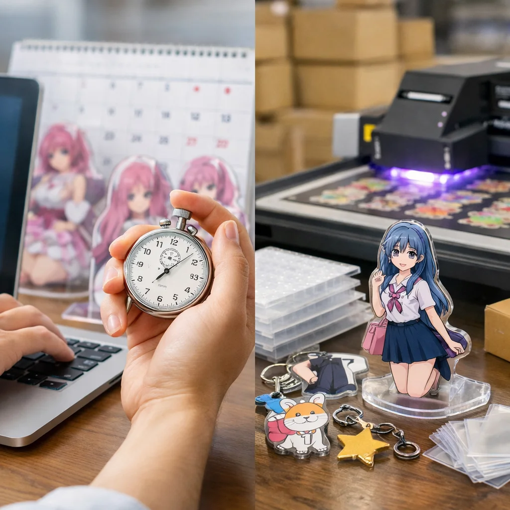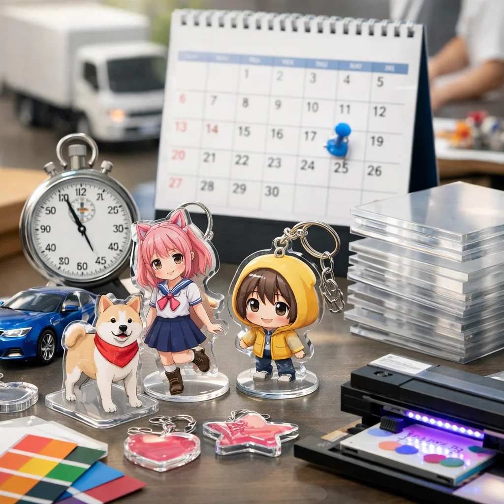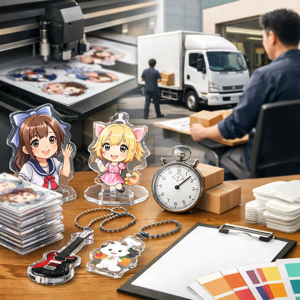 アクリルグッズの納期短縮には、テンプレ利用や推奨入稿形式の活用、校正回数削減が要です。また、特急オプションには追加料金の注意が必要です。
