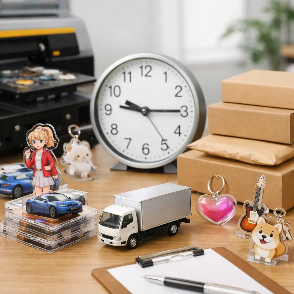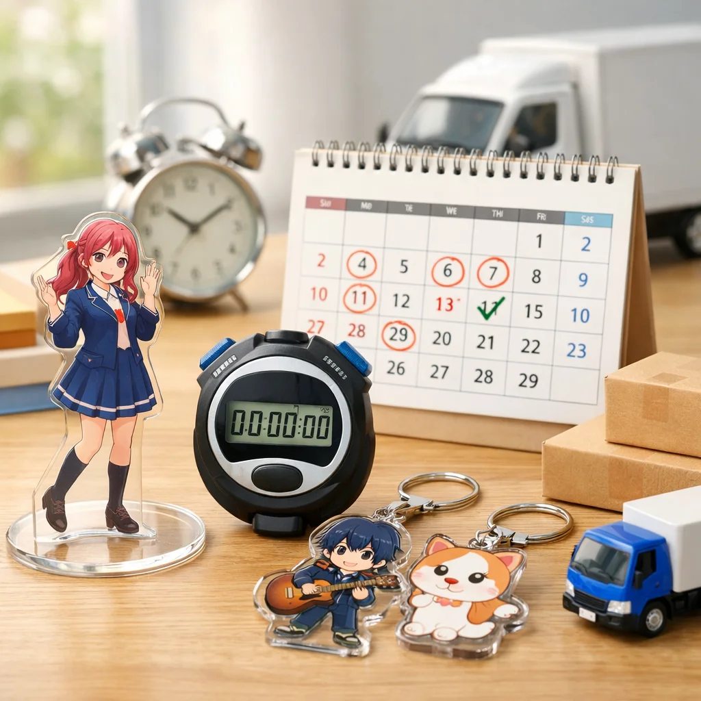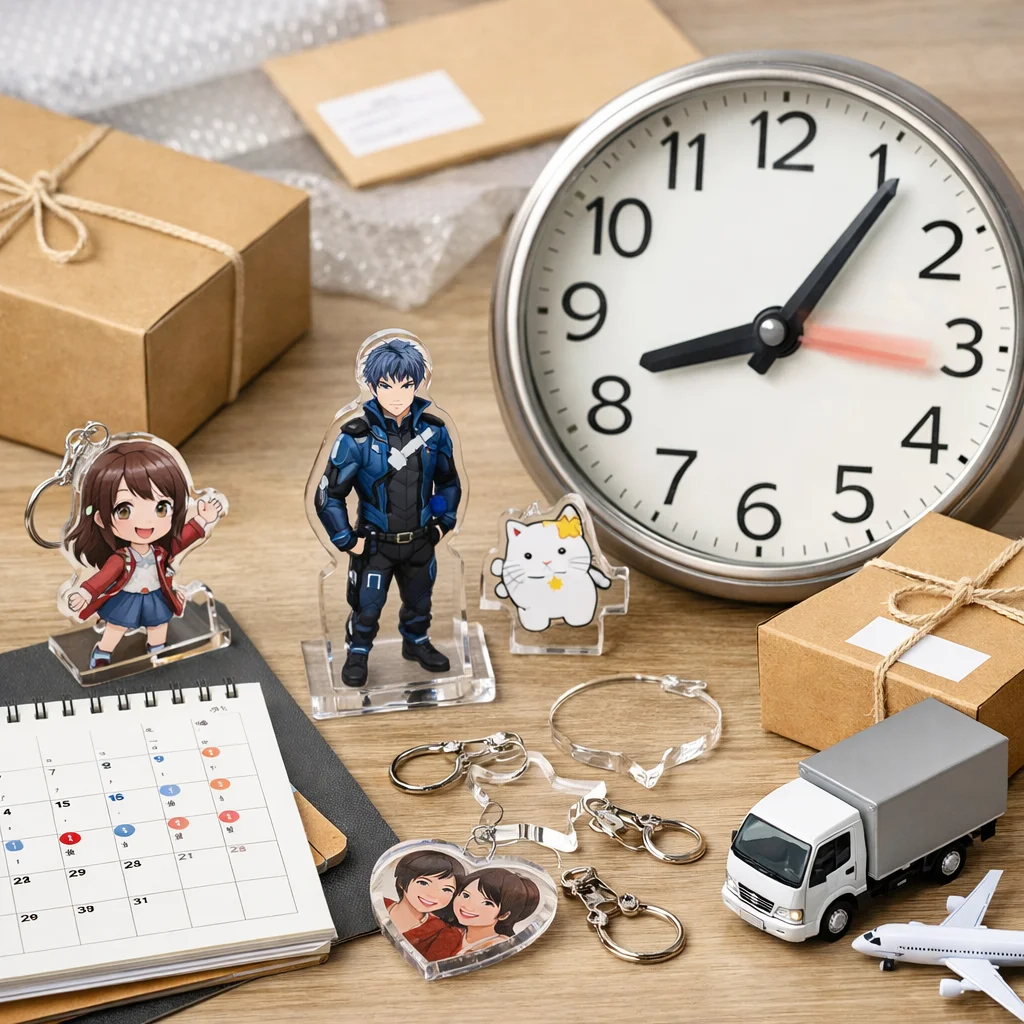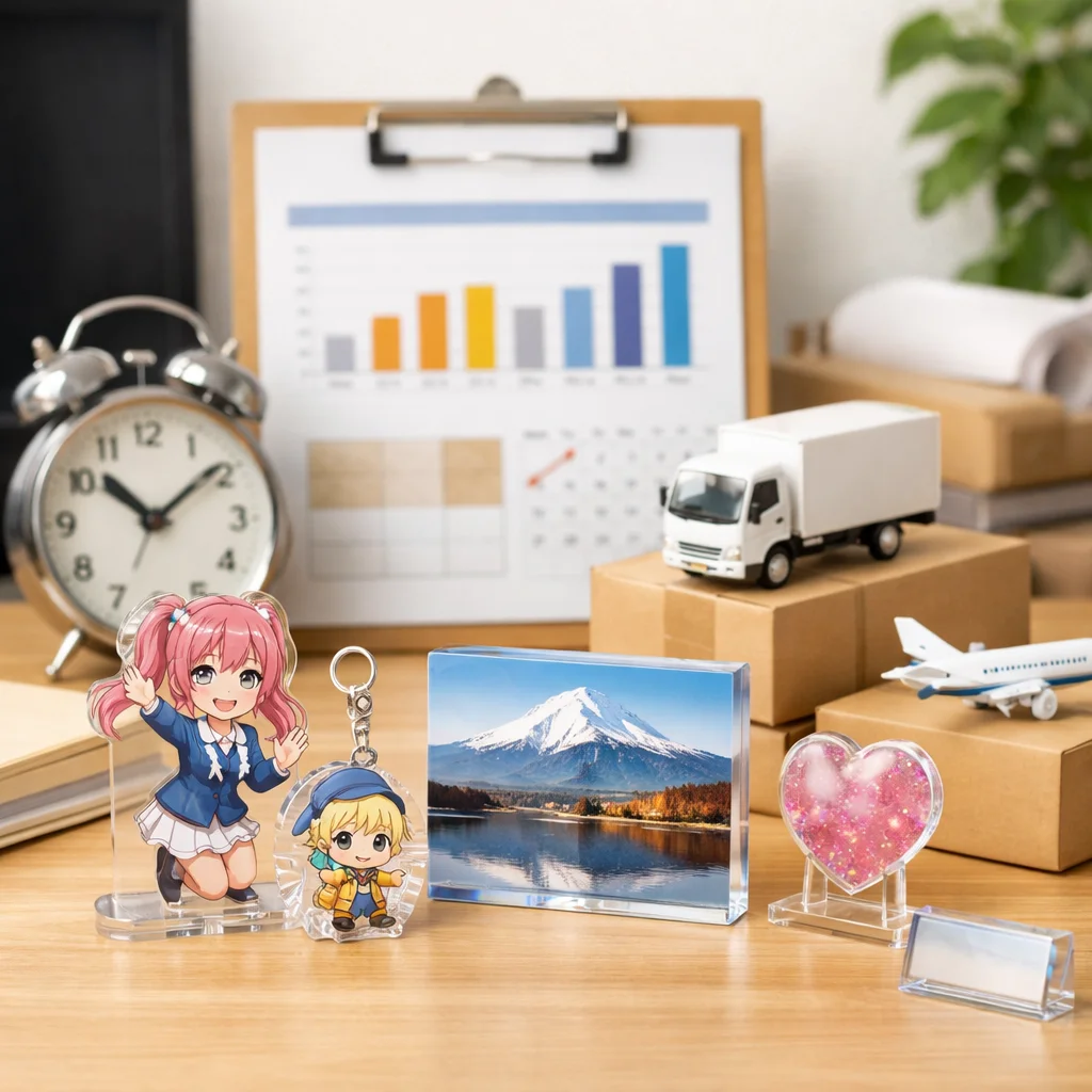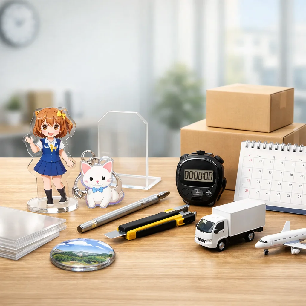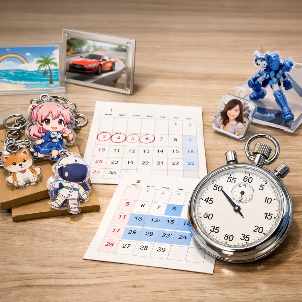 アクリルグッズの納期は、繁忙期に特に影響を受ける。早割や校正遅延、物流混雑が要因で、計画的な逆算スケジュールが重要。