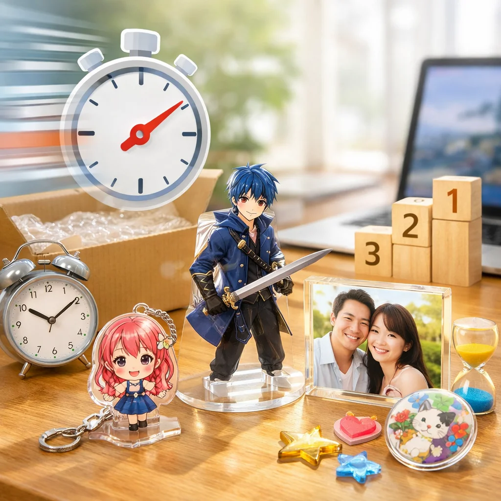 アクリルグッズの製作では、**最短**日数を求める際に、特急料金や優先制作、分納などの追加料金が発生する場合があります。これらを事前に確認し、比較することが重要です。
