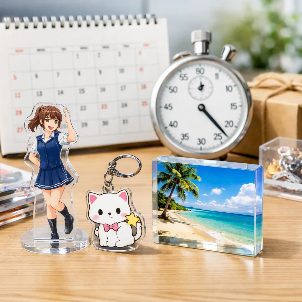 | アクリルスタンド | 約7~10日間 | 約14~21日間 | 材料の在庫状況や加工内容による | ディスプレイ、デスクトップアクセサリー |