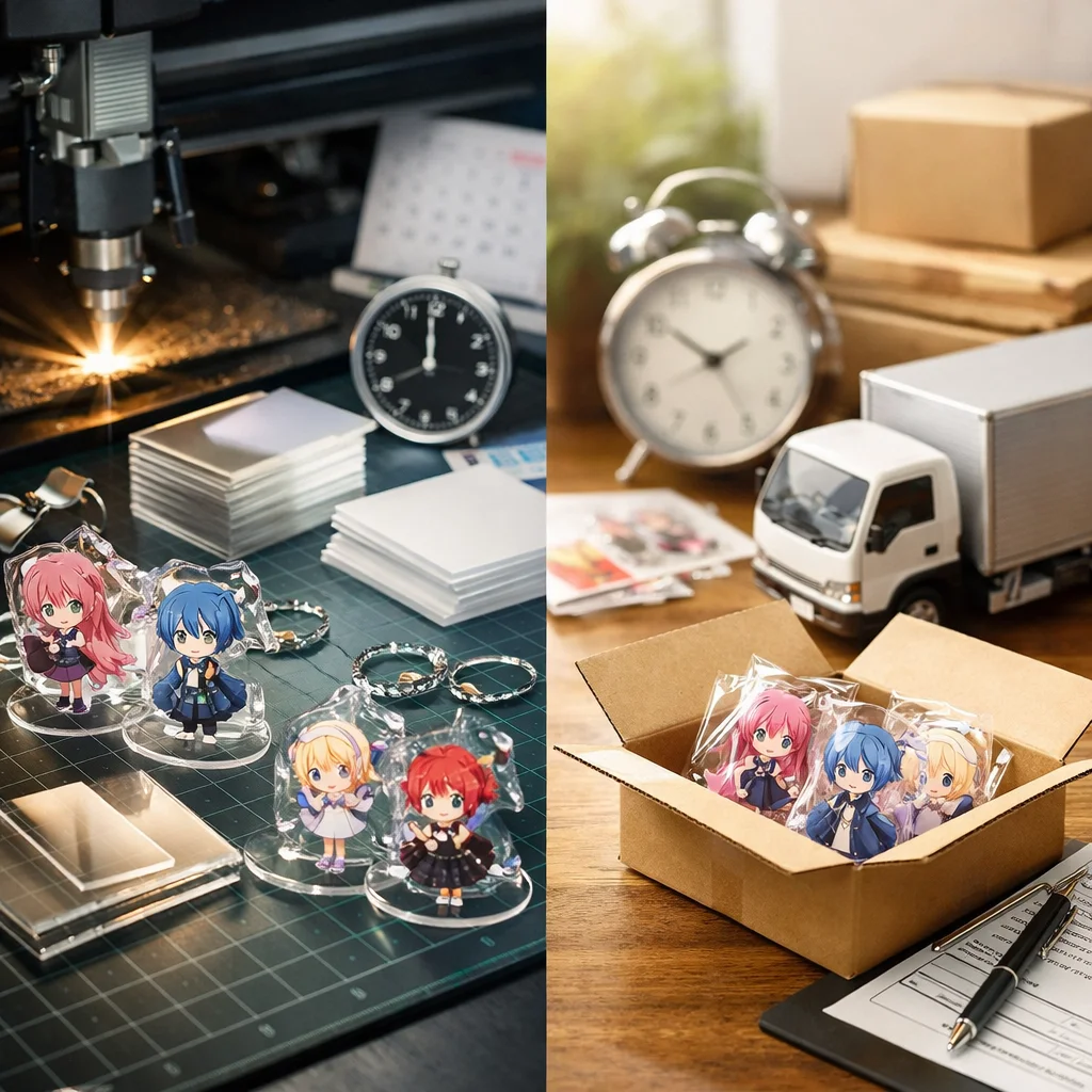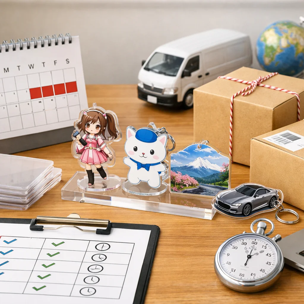 アクリルグッズの納期は、データ確定日、製造日数、工程数、混雑、ロット、資材、検品、配送など多くの要因によって決まる。特に、入稿基準、校了基準、出荷基準を理解することで納期を見極められる。