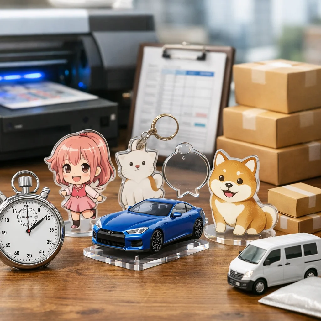 アクリルグッズの納期は、データ確定日、製造日数、工程数、混雑、ロット、資材、検品、配送などの要因によって決まります。入稿基準、校了基準、出荷基準を理解することで、正確な納期を見極め、円滑な発注が可能になります。